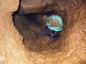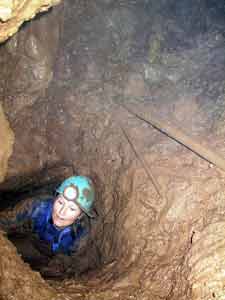 Work continues as time available. Main rift has reached floor but route continues down clay filled bedding. Higher level clay filled phreatic passage goes down dip to short vertical drop leading to rift with standing water in wet weather. Very pleasant on a sunny afternoon.